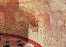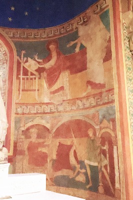 | 北後陣祭室のフレスコ画は、福音記者聖ヨハネの生涯に捧げられ、2人の兵士に先導されて聖人が逮捕される場面、聖人が冠を戴く王に死刑を宣告される場面、聖人の斬首の場面が観察されます。 但し北後陣祭室のフレスコ画は、19世紀に大部分が描き直されています。 Les fresques de l'absidiole septentrionale sont consacrées à la vie de saint Jean l'Evangéliste et montrent notamment l'arrestation du saint conduit par deux soldats, sa condamnation à mort par un roi couronné et sa décollation. Toutefois, ces peintures ont été en grande partie reprises au 19e siècle. 下段には、中央に描かれた神の子羊のもとへ、数多くの四肢動物が歩み寄る場面が描かれています。子羊の足元からはエデンから流れ出でる4つの川を連想させる4つの水流が流れ出し、動物達はその水の上を進むように描かれています。 Dans la partie inférieure, de nombreux quadrupèdes s'avancent vers l'Agneau de Dieu figuré au centre. De ses pieds jaillissent quatre cours d'eau évoquant les fleuves du Paradis, sur lesquels les animaux semblent progresser. |