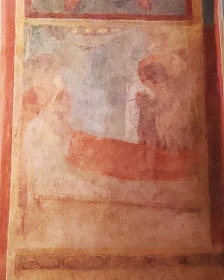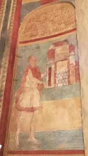 | Fresques de l'absidiole sud du choeur 南側廊の後陣祭室のフレスコ画は、良好な状態で残ります。壁画は洗礼者ヨハネの殉教を表現しており、左から右、上から下に向かって、ヘロデ王と洗礼者ヨハネ、牢獄に閉じ込められたヨハネ、ヘロデとサロメ、ヨハネの首がサロメのもとに運ばれる場面、2人の弟子がヨハネの遺体を引き取る場面、2人の仲間がヨハネの遺体を墓におさめる場面、ヨハネが2人の修道士に啓示を与える場面、ヨハネの首が墓におさめられる場面が描かれます。 Les fresques de l'absidiole du collatéral méridional sont mieux conservées. Elles illustrent le martyre de saint Jean-Baptiste et se lisent de gauche à droite, de haut en bas : Jean-Baptiste devant Hérode, Jean-Baptiste en prison, Hérode et Salomé, la tête de Jean-Baptiste apportée à Salomé, le corps de Jean-Baptiste recueilli par deux disciples, le corps du saint déposé dans un tombeau par deux compagnons, la révélation à deux moines et, enfin, la mise de la tête de Jean-Baptiste dans un tombeau. |