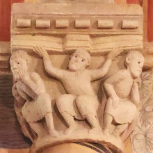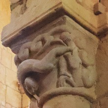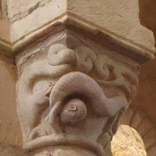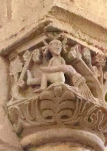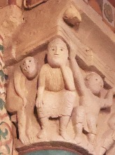 | Acrobate et serpents ひとりの裸の男が仰向けの姿勢で柱頭の縁にしがみついています。この人物は胸と足を2匹のモンスターのようなヘビに咬まれています。ヘビの尾は螺旋を描き互いに絡み合っています。 専門家の多くは、この場面を「悪の力と戦う人間」の寓意、又は「ヨナと巨大魚(或いはクジラ)」の場面を表したものと解釈しています。 Un homme nu, représenté la tête en bas, s'agrippe des mains à l'astragale du chapiteau. Il est mordu à la poitrine et aux pieds par deux serpents monstrueux dont les queues, en spirale, s'entrelacent. Selon plusieurs spécialistes, il s'agirait soit de la représentation de l'homme luttant contre les forces du mal, soit d'une évocation de Jonas et du gros poisson. |