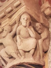 Combat des vieillards この柱頭は怒りという悪徳を表現しています。 正面では2人の顎髭を生やした老人が、互いの髭と髪を掴んで取っ組み合っています。 両角には、長い顎髭を生やし尖った耳を持つ悪魔のような顔が彫られていて、舌を突き出しています。 左側の面では、2人の男或いはサルが抱き合っており、右側の面には、怒った男の姿があります。 Ce chapiteau illustre le vice de la colère. Sur la face principale, deux vieillards barbus s'empoignent par la barbe et les cheveux. Aux angles, des masques diaboliques, à la barbe démesurément longue et aux oreilles pointues, tirent la langue. Sur la face gauche, deux hommes ou singes s'embrassent, tandis que sur la face droite se tient un homme en colère. |