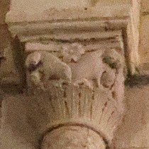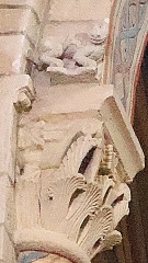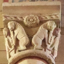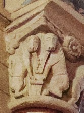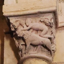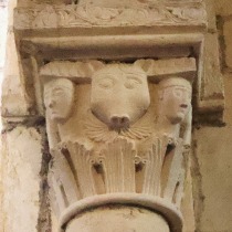 Lions affrontés 身廊には向かい合ったライオンを描いた柱頭が複数あります。 この柱頭では、ライオンは前脚を人間の頭の上に置いています。 La nef compte plusieurs chapiteaux figurant des lions affrontés. Sur celui-ci, les deux lions posent leur patte sur une tête humaine. |