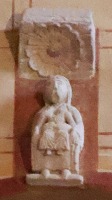 | パレ・ル・モニアルのイエロン博物館に、アルシーの門と呼ばれる第三の大きな入り口が収蔵されています。この入り口は、小修道院の囲いの西側にあったかつての正面入り口にあったものです。この門は1125‐1130年に制作されたものですが、革命時に解体された後、個人の所有者のもとアルシー城に保管されていましたが、1896年に博物館に寄贈されました。 タンパンには栄光のキリストが描かれ、リンテルには、聖人や聖女に囲まれた聖母マリアが幼子イエスに授乳するという極めて珍しい場面が描かれています。彫刻のスタイルは、他のアンジーの彫刻家らのものとは異なります。 |