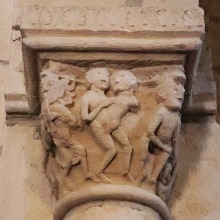 Luxure この不可思議な柱頭は、全体として色欲を表現しています。 左側の面では、ライオン使いが鬣のある獣を調教しています。 柱頭の角には2人の悪魔の姿があり、このうち左側の悪魔は炎のような髪型をしていて、縦笛のような楽器を吹いています。 正面には2つの胴体(男性と女性)が脚で繋がっている人物が見えます。 更に右面には、裸で頭を下にした逆さまの姿勢で身体の上に巨大な足を上げている別の人物の姿があります。これは伝説上の種族であるスキアポデスです。 Ce chapiteau énigmatique illustre, dans son ensemble, le vice de la luxure. Sur la face gauche, un dresseur de lion maîtrise une bête à crinière. Aux angles surgissent deux diables, dont celui de gauche à la chevelure en forme de flammes joue d'un instrument à vent proche de la flûte. |
