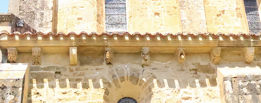 | 外観では、コルニッシュを支えるモディヨンの豊かな装飾も、この教会堂の特徴です。モディヨンは大半が彫刻されていて、キュクロプス、セイレーン、アトランテ、棘を抜く男、舌を出す修道士、騎士、人間の手、猿、ペリカン、コウモリ、空想上の動物といった、驚くほど多様な図像が展開されます。更には勿論のこと、植物や幾何学モティーフも見られます。 但し、北側廊のモディヨンには彫刻装飾は施されていません。 |