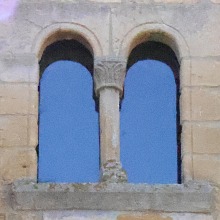 | 入り口の上には、植物の装飾が施された柱頭彫刻を戴く小円柱で装飾された半円型の開口部が穿たれています。 Au-dessus du portail, s'ouvre une large baie en plein cintre, flanquée de colonnettes aux chapiteaux sculptés à feuillages. |