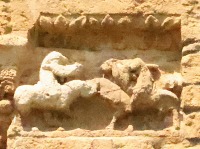 | Relief encastré 門の右側には、2人の人物が馬に乗って戦う場面を描いたレリーフが埋め込まれています。 A droite du portail se trouve un relief représentant une scène de combat entre cavaliers. |