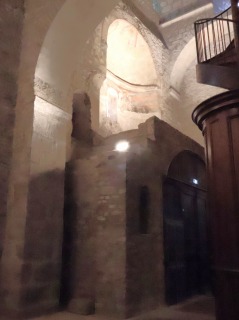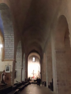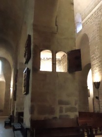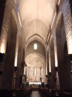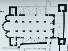 | 修道院が現在の場所に移転した直後の教会堂については、あまり解明されていません。恐らく慎ましやかな建物が教会堂として利用されていたと考えられます。 11世紀になってより大きな建物が建設され、1046年に献堂されました。その後身廊にヴォールトが架けられ、内部にフレスコ画の装飾が施された後、建物は改めて1157年に奉献されました。 |