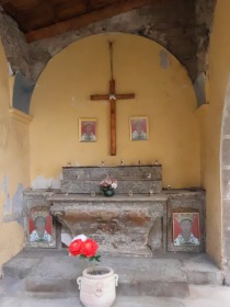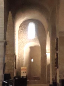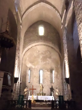 | Choeur 内陣は尖頭型のヴォールトで覆われた方形のベイと、セミ・ドームに覆われた半円プランのアプスで構成されます。アプスには3つの細長い開口部が設けられています。アプス入り口のアーケードの上に、更に小さな開口部があります。 Le choeur occidental est composé d'une travée droite voûtée en berceau brisé et d'une abside hémicirculaire en cul-de-four. Cette dernière est percée de trois étroites baies. Dans le mur-pignon, au-dessus de l'arcarde d'entrée de l'abside, est ajourée une petite baie en plein cintre. アプスの両側にアプスより奥行きが浅い後陣祭室があります。 南後陣祭室は、かつてはペトロを祀っていました。北後陣祭室には、18世紀より聖金曜日の夜の行列の際に用いられている磔刑の十字架があります。 De part et d'autre de l'abside, se trouvent deux absidioles hémicirculaires peu profondes. L'absidiole sud était à l'origine dédiée à saint Pierre. Celle du nord abrite le crucifix utilisé depuis le 18e siècle pour la procession nocturne du Vendredi saint. |