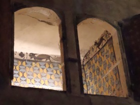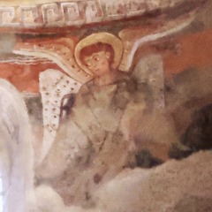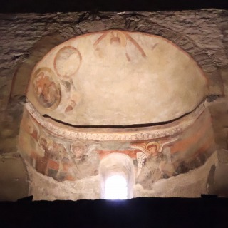 Chapelle haute 聖ミカエルと大天使を祀る高い位置にある中央祭室には、12世紀のフレスコ画が残ります。 セミ・ドームには、四福音記者に囲まれた栄光のキリストが描かれていますが、大半は消えてしまっています。 壁面、小さな半円型の開口部の両側には、セラフィムの姿があります。セラフィムの翼には目の模様が描かれています。セラフィムの頭上に、ギリシア雷紋の装飾が見えます。 Dédiée à saint Michel et aux archanges, la chapelle haute d'axe conserve des fresques du 12e siècle. Sur le cul-de-four, est figuré le Christ en majesté, entouré de quatre évangélistes, toutefois largement effacé. Sur le mur, de part et d'autre d'une petite baie en plein cintre, sont représentés des séraphins aux ailes ocellées. Au-dessus d'eux, court une bande peinte d'une grecque. |