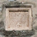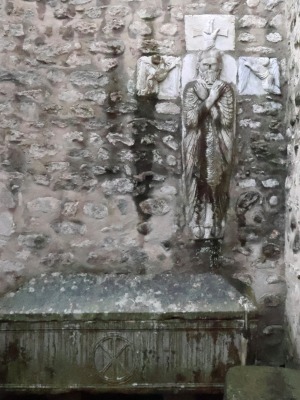 | Le personnage sculpté croise les mains sur sa poitrine et porte une tunique longue recouverte d'un manteau. Il est accompagné de trois plaques de pierre sculptées. Une plaque supérieure montre une main bénissante sur une croix pattée, avec une insciption latine. Les deux plaques de chaque côté du personnage, illustrent un ange à genoux, ailes déployées, regardant la main. |