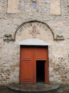 Portail oriental 入り口の上に、プレ・ロマネスクの時代に遡る地元の花崗岩で造られた山型のリンテルがあります。リンテルにはアルファとオメガの文字と、それらの両脇にAの文字が刻まれています。 La porte est surmontée d'un linteau en bâtière en granit local, datant de l'époque préromane. Il est gravé de l'alpha et de l'oméga, encadrés de deux A. |