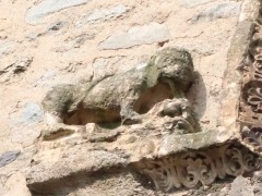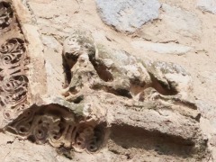 Archivolte et consoles タンパンを取り囲むアーキヴォールトはパルメットで装飾されています。アーキヴォールトの両端には、獲物(人間?)を貪り食うライオンの姿があります。 Entourant le tympan, une archivolte ornée de palmettes se termine par deux consoles illustrant deux lions dévorants leur proie (un homme ?). |