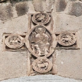 | Tympan : le Christ en majesté タンパンの中、分散アーチの内側に、ギリシア十字が設置されています。 このギリシア十字の中央には栄光のキリストが彫刻されていて、アーモンド型のマンドルラの中でキリストは玉座につき、指を人差し指と中指を立てて祝福をしています。 十字架のアーム部分にはそれぞれ、メダイヨンの中に四福音記者のシンボル(ヨハネの鷲、マルコのライオン、ルカの雄牛、マタイの天使)が描かれています。キリストのマンドルラと福音記者のメダイヨンは、4つの小花モティーフで繋っています。 Dans le tympan, à l'intérieur de l'arc de décharge, prend place une croix grecque. Au centre de celle-ci, est représenté un Christ en majesté : dans une mandorle en forme d'amande, le Christ trône et bénit de ses deux doigts levés (index et majeur). Sur les branches de la croix, les symboles des quatre évangélistes (un aigle pour saint Jean, un lion pour saint Marc, un taureau pour saint Luc et un ange pour saint Mathieu) sont inscrits dans des médaillons. La mandorle du Christ est reliée aux médaillons des évangélistes par quatre fleurettes. |