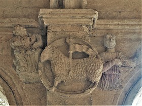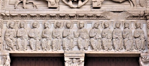 Sur le linteau, se trouvent les douze apôtres assis et tenant un livre sur les genoux. |