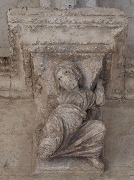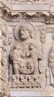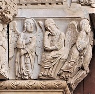 | 1層目のフリーズの続き、リンテルを支える左側のピラスターの柱頭に、物思いにふけるヨセフと、受胎告知の場面があります。ヨセフは天使を見つめ、左手に地球を掲げたマリアの前に、天使が現れます。 | ||