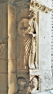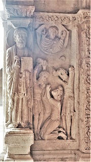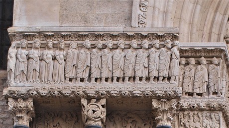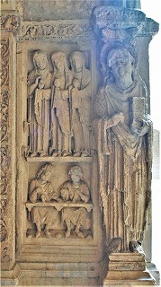 | Troisième registre du côté occidental à la partie gauche : saints 左部分・西正面の3層目、キリストの幼少期を描いたフリーズの下には、3人の聖人が並びます。右からトロフィムス、大ヤコブ、使徒バルトロマイ(バルテルミー)です。 司教杖を手にしたトロフィムスに、2人の天使がミトラを被せています。 Sous la frise représentant l'enfance du Christ, se trouve trois saints : de droite, saint Trophime, saint Jacques le Majeur et saint Barthélemy. Saint Trophime portant la crosse, est couronné d'une mitre par deux anges. |