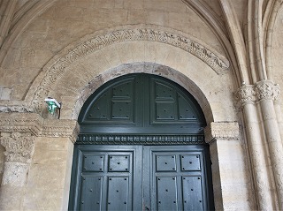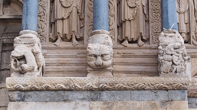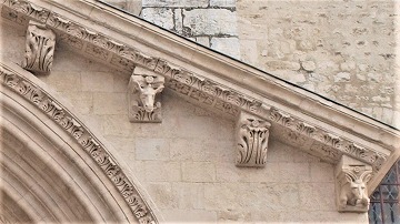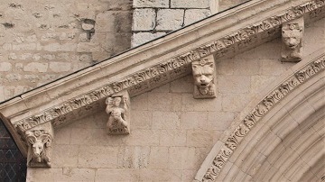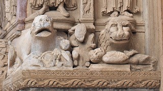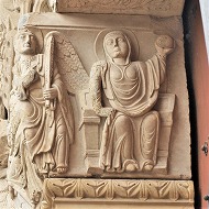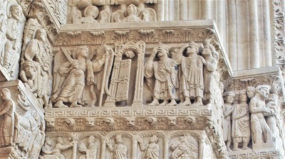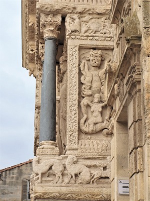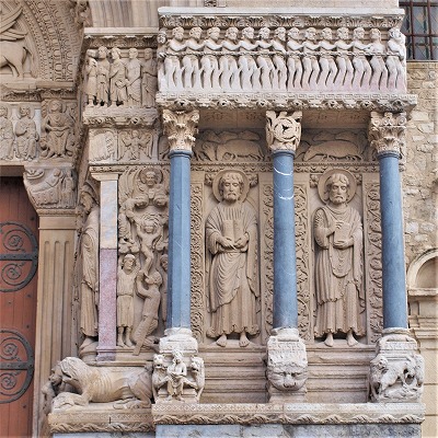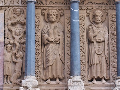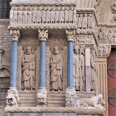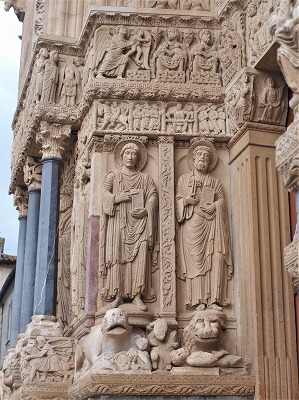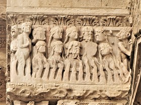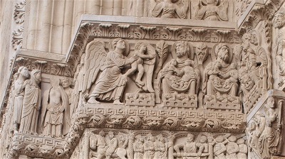 | 豊かな彫刻装飾が施された西入り口は、1180-1190年の間に造られました。この入り口のテーマは、基本的に最後の審判です。 この入り口は、1120-1160年の間に造られたサン・ジル修道院教会のファサードから多大な影響を受けているとされます。また、古代美術、特に初期キリスト教時代の石棺からもインスパイアされているとされ、その影響は、人物と装飾の植物モティーフのスタイルに見られます。 その威厳を強調するため、入り口は階段の上に設置され、そのため身廊に1.5メートル程盛り土することを余儀なくされました。 |