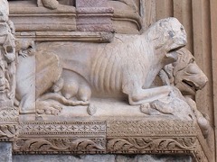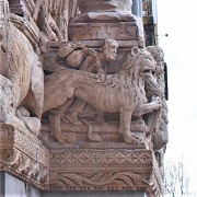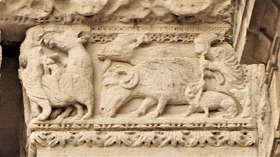 Quatrième registre du côté sud à la partie gauche 左部分・南側の4層目、ペトロと使徒ヨハネの下に、3頭の動物が並びます。右から、人間を圧倒するライオン(原罪を象徴)、色欲を象徴するロバ、子ライオンを連れ、雄ヤギを引き裂く雌ライオンです。雌ライオンの乳房は膨らんでいて、一羽の鳥が雌ライオンの尻を突いています。 Sous les statues de saint Pierre et saint Jean l'évangéliste, se trouvent trois animaux : de droite, un lion, symbole du pèche, terrassant un homme, un âne, symbole de la luxure, et une lionne accompagnée de ses lionceaux, déchirant un bouc. Les mamelles de la lionne sont gonflées, et un oiseau lui picore la croupe. |