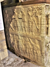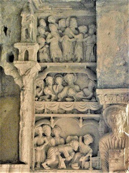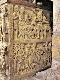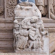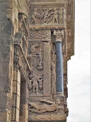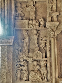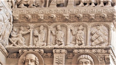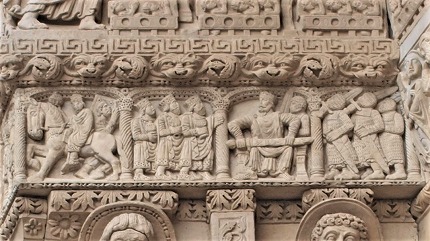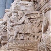 左部分・西正面にある2層目のフリーズは、キリストの幼少期を表現しています。右から、馬に乗ったマギ達、幼児虐殺、エジプト逃避です。 |