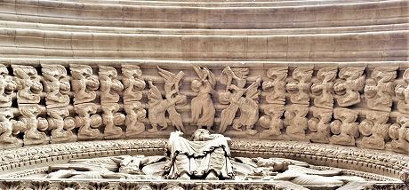 Des anges en adoration entourent le tympan. Au sommet de l'archivolte, trois anges jouent de la corne : ils annoncent le Jugement dernier. |