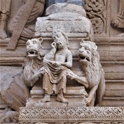左端の多角柱の土台には、2頭のライオンに挟まれ瞑想しているダニエルが描かれています。 Le socle gauche présente Daniel en méditation entre deux lions. |