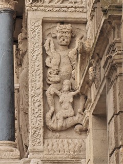 | Troisième registre du côté sud à la partie droite : démon 右部分・南側面の3層目には、悪魔が地獄に堕ちた2人の人物を、頭を下にして抱えています。悪魔の下にいるモンスターのようなものに馬乗りになった裸の女性は、色欲を象徴しています。 Un démon tient deux damnés la tête en bas. Une femme nue, qui chevauche un monstre, symbolise la luxure. |
