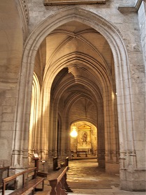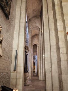 | Nef 身廊は12世紀半ばに遡り、凡そ長さ40メートル、幅15メートル、高さ20メートルという大きさです。 身廊は5ベイに分かれ、横断アーチがはしる尖頭型のヴォールトで覆われています。横断アーチは、コリント式の柱頭彫刻がある、縦に溝彫りされた又はねじり模様の装飾が施された小円柱に繋がり、次に十字型のピラーに繋がっていきます。 身廊に積まれた石には、下働きの人達が残したサインが数多く刻まれています。 Datant du milieu du 12e siècle, la nef mesure d'environ 40 m de long, 15 m de large et 20 m de haut. Elle se compose de cinq travées, voûtées en berceau brisé, sur doubleaux, retombant d'abord sur les colonnettes cannelées ou torses à chapiteaux corinthiens, puis reposant sur les piliers cruciformes. On trouve de nombreuses marques gravées de tâcherons sur les appareils de la nef. 1835年、6世紀の最初の教会堂があったとされる場所、身廊の1・2番目のベイの下に、ヴォールトで覆われたスペースの遺跡が発見されました。このスペースは、全体で幅15メートル、長さ9メートルという長方形の形をし、更に3つのスペースに分かれています。 En 1835, des vestiges des espaces voûtés en berceau, ont été mis au jour sous les deux premierès travées de la nef, l'emplacement supposé de l'église primitive du 6e siècle. Cet ensemble rectangulaire de 15 m de large sur 9 m, se divise en trois salles. |