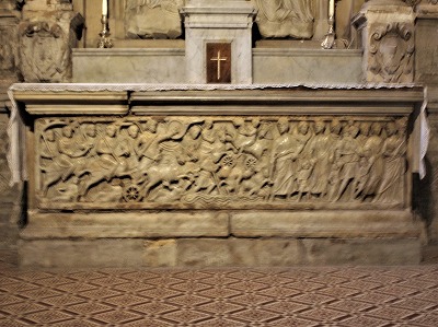 北ギャラリーの中間・東側のピラーについて、中央にはやはり復活したキリストが刻まれています。 |
