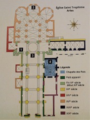 | 最初のステファノを祀ったバシリカは、4世紀初めにL'Hauture(又はAuture)地区に建てられたとされます。教会堂は6世紀に現在の場所にて再建され、カテドラルになります。しかし8世紀のサラセン人やフランク人による動乱により教会堂は破壊され、そこで教会堂はカロリング朝時代、恐らく同世紀の間に再建されたようです。 教会堂は新たに1078-1152年の間に再建され、ここに1152年、トロフィムスの聖遺骨が、アリスカンから移送されます。この時代に、教会堂の称号はサン・トロフィームに変更され、アルルは巡礼地となりました。 15世紀半ば、内陣が再建され、周歩廊が新たに造られました。 革命時、教会堂は理性の崇拝の神殿となりました。1801年、アルル大司教区はエクス・アン・プロヴァンス大司教区と統合され、教会堂は教区教会になり、更に1882年、マイナー・バジリカに格上げされました。 La basilique primitive, dédiée à saint Etienne, aurait été érigée au début du 4e siècle dans un quartier appelé l'Hauture (ou Auture). Au cours du 6e siècle, elle aurait été reconstruite à l'emplacement actuel, et transformé en cathédrale. Mais le tourmente des invasions du 8e siècle, a provoqué la déstruction de l'église, et la reconstruction à l'époque carolingienne, probablement au cours du même siècle. Elle a été à nouveau reconstruite entre 1078 et 1152. En 1152, les reliques de saint Trophime y ont été transférées des Alyscamps. A cette époque, l'ancien vocable a été remplacé par celui de Saint-Trophime, et Arles est devenue un lieu de pèlerinage. Au milieu du 15e siècle, le choeur a été reconstruit, avec la création d'un déambulatoire. Lors de la Révolution, l'église a été reconvertie en temple de la Raison. En 1801, l'archediocèse d'Arles a été fusionné avec celui d'Aix-en-Provence, et l'église est devenue paroissiale. Puis, elle a été érigée en basilique mineure en 1882. |