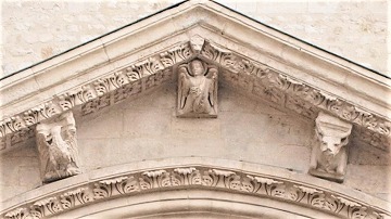 | タンパンはキリストの再臨を表現しています。マンドルラの中で玉座についたキリストは、右手の2本の指で祝福のポーズをし、膝の上に福音書を載せています。キリストは四福音記者のシンボル(ヨハネの鷲、ルカの牛、マルコのライオン、マタイの天使)に囲まれています。 | ||