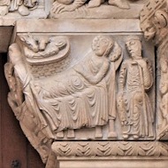 | 12使徒のリンテルを支える右側のピラスターの柱頭には、キリスト降誕と幼子イエスの湯あみが描かれています。 キリスト降誕の場面では、マリアはベッドに横たわり、その枕元でヨセフは腰を掛け、物思いに耽っています。イエスはまぐさ桶に寝かされ、牛とロバが覗いています。イエスの沐浴の場面では、2人の女性が幼子を湯に浸からせており、イエスの上に聖霊を象徴する鳩が舞い降りています。 |