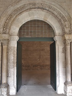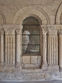 Entrée de la salle capitulaire 北ギャラリーの北壁に、半円型の開口部に挟まれるようにして、チャプター・ハウスへのやはり半円型の入り口があります。小円柱の柱頭には、モンスターが彫刻されています。 Sur le mur nord de la galerie nord, est percée l'entrée de la salle capitulaire encadré des baies en plein cintre. |