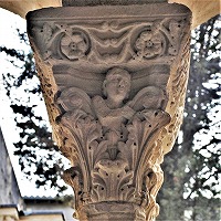 | Les écoinçons des arcatures de la galerie orientale, intègrent des éléments gothiques, représentant les vierges sages et vierges folles, les symboles des évangélistes, etc.. |