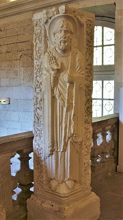 | Pilier de l'angle nord-est : saint Etiennequi était le patron principal de l'églisependant près de sept siècles C'est la composition symétrique à celle du pilier nord-ouest avec la statue de saint Trophime. |