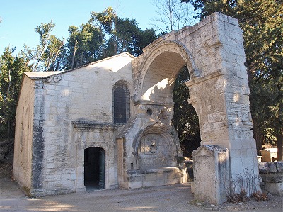 Chapelle Saint-Accurse et arcade romane de l'ancienne eglise Saint-Césaire アリスカンの入り口の傍に、1520年に建設されたサン・アキュルズ礼拝堂が建っています。その礼拝堂にはりつくようにして、サン・セザール・ル・ヴュー教会の遺構である12世紀に遡るロマネスクのポーチが残ります。 Située à l'entrée du site, se trouve l'ancienne chapelle Saint-Accurse, bâtie en 1520, à laquelle est accolée une grande arche. Il s'agit des vestiges du porche roman datant du 12e siècle de l'église Saint-Césaire-le-Vieux. |