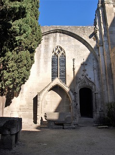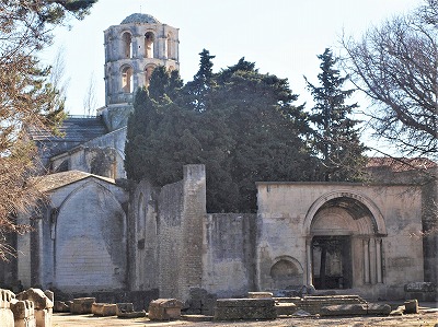 | アリスカンの教会堂の歴史は未だ解明されていませんが、5世紀にはゲネシウスの墓の周りに、この聖人を祀ったバシリカが存在したようです。 1040年頃、アルル大司教により、教会堂はマルセイユのサン・ヴィクトール修道院に譲渡されます。そこで教会堂は再建され、サン・ジュネ・エ・サン・トノラ教会という名になります。この頃アリスカンは、サン・ジャック・ド・コンポステーラ巡礼路(トゥールーズの道)の出発点となります。12世紀半ば、教会堂の再建が始まり、教会堂の名はサン・トノラ教会となります。しかし工事は同世紀末に資金不足により中止されました。 1616年、ミニム修道士らがアリスカンにやって来て修道院を建て、既に廃墟となっていた教会堂を修復します。→ L'histoire de l'église des Alyscamps est encore imprécise : il existerait au 5e siècle, une basilique dédiée à saint Genès, bâtie autour du tombeau de ce saint. Vers 1040, elle a été concédée à l'abbaye Saint-Victor de Marseille par l'archevêque d'Arles. Elle a été alors reconstruite, et placée sous le vocable de Saint-Genès-et-Saint-Honorat. A cette époque le site est devenu le point de départ du chemin d'Arles (Via Tolosana) vers Saint-Jacques-de-Compostelle. Au milieu du 12e siècle, la reconstruction de l'église a entrepris : l'église a été placée sous le titre unique de Saint-Honorat. Mais les travaux ont été abandonnés à la fin du 12e siècle, par manque de moyens. Arrivés sur le site en 1616, les Minimes ont bâti leur couvent, et restauré l'église déjà ruinée.→ |