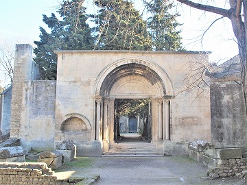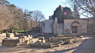 | アリスカンという語はプロヴァンスの言葉で、フランス語では「シャンゼリゼ」、「エーリュシオン」を意味し、ローマ時代には、冥界の一部で、高潔な魂が死後過ごすところと信じられていました。 | Le nom "Alyscamps", mot provençal, signifie "Champs Elysées : selon la religion romaine, il s'agit une partie des Enfers, où les âmes vertueuses séjournaient après la mort. | |||