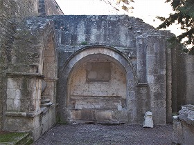 | 身廊が建てられる筈だったスペースの北東には、ゲネシウスを祀ったロマネスクの祭室があります。この祭室は13世紀に壁で閉じられました。 この祭室の南西の角に見えるのは、十字型をしたピラーの基部です。 |