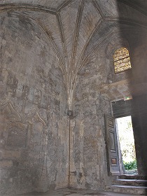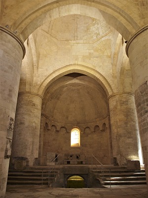 | Choeur et abside 12世紀半ばに遡るサンクチュアリは、数段高いところに設けられていて、円筒型のヴォールトで覆われた1ベイの狭い内陣と、セミ・ドームで覆われた半円プランのアプスで構成されます。 Surélevé de quelques marches, le sanctuaire du milieu du 12e siècle, est consisté d'un choeur étroit d'une travée, voûtée en plein cintre, et une abside hémicirculaire en cul-de-four. アプスのヴォールトの中心に置かれた半円型の石には十字架が刻まれています。この石は半円のリブに囲まれて、そこから4本の平らなリブがのびています。 アプスは7つの連続した半円型のアーチで装飾されています。連続アーチは8つの円柱で支えられていましたが、円柱は革命後に消失しました。この装飾は、サント・マリー・ド・ラ・メールのノートル・ダム・ド・ラ・メール教会のアプスを連想させます。 Sculptée d'une croix, la clef de voûte de l'abside, est encadrée d'une nervure hémicirculaire, de laquelle courent les quatre nervures plates. L'abside est ornée de sept arcatures en plein cintre, qui ont été supportées par huit colonnettes, disparues après la Révolution. Cet ornement rappelle de cellui de l'abside de l'église Notre-Dame-de-la-Mer de Saintes-Maries-de-la-Mer. |