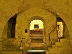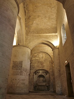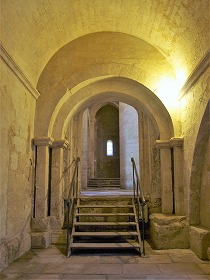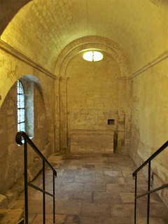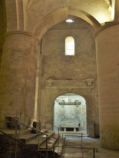 内陣手前の下り階段は、アプスの下に位置するクリプトに繋がります。 L'escalier descendant devant le choeur conduit à la crypte, située sous l'abside surélevée. ヴォールトで覆われた狭いクリプトは、カロリング朝の時代に遡るとされ、先行する教会堂のアプスでした。ここにはゲネシウス、ホノラトゥス、ヒラリウスに加え、その他アルルの初期の司教らの聖遺骨が納められていました。 Voûtée en berceau, la crypte très étroite daterait de l'époque carolingienne : elle était l'abside de l'édifice antérieur. Elle abritait les reliques de saint Genès, d'Honorat, d'Hilaire, et d'autres premiers évêques d'Arles. |