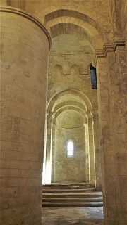 | トランセプトと身廊をアプスから見たイメージです。 二重アーチとアーケードは、十字型をしたピラーに繋がります。これらのピラーには基礎がなかったため、16世紀にピラーの周りに石を円筒型に積んで囲むことによって補強されました。トランセプト交差部と身廊の間にあるの2つの柱は、直径3.10メートルあります。 身廊の西側の壁には、入り口と、その上に半円型の開口部があります。 |