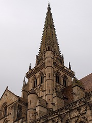 Flanc est 大聖堂の外観はもはやロマネスクの様相ではなく、ゴシックの尖塔、ガーゴイル、13世紀末に付け足されたフライング・バットレス、ゴシックの彫刻が見られます。教会堂脇の14の祭室は、15世紀末から16世紀初めにかけて、ゴシック・フランボワイヤン様式で建てられました。 ブルゴーニュでよく見かけるように、屋根は多色の釉が塗られた瓦で覆われて、幾何学モティーフを形成しています。 L'extérieur de la cathédrale n'est plus roman. On y trouve une flèche gothique, des gargouilles, des arcs-boutants de la fin du 13e siècle, et de nombreuses sculptures gothiques. Les quatorze chapelles latérales sont construites de la fin du 15e au début du 16e siècles dans le style gothique flamboyant. Comme fréquemment en Bourgogne, les toits sont couverts de tuiles vernissées aux couleurs variées, formant des motifs géométriques. |