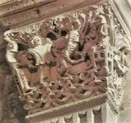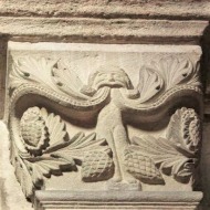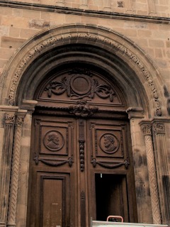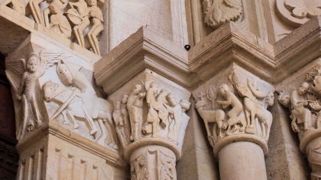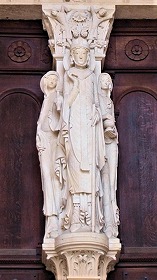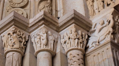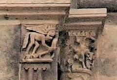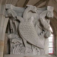 入り口脇の円柱は、幾何学模様と植物モティーフで装飾され、脇に溝彫りされたピラスターがあります。 Six colonnes des jambages du portail sont ornées de motifs géométriques et végétaux et flanquées de deux pilastres cannelés. これら6本の円柱の柱頭には、彫刻が施されています。柱頭のテーマは左から、イソップ寓話の狼とコウノトリ、砂漠に召使アガーを追放したアブラハム、ヴィオル(弦楽器)を携えたヨハネの黙示録の6人の長老です。 ピラスターのコーベルには、ヒッポグリフ(前半身が鷲、後半身が馬)又はグリフォン(前半身が鷲、後半身がライオン)があらわされています。 Ces six colonnes, sont surmontés des chapiteaux sculptés. Les chapiteaux sont consacrés, de gauche, au loup et à la cigogne de la Fable d'Esope, à Abraham qui renvoie sa servante Agar dans le désert, et à six vieillards de l'Apocalypse munis de leur viole. Pour le corbeau surmontant les pilastres, on admire un hippogriffe, ou griffon. |