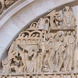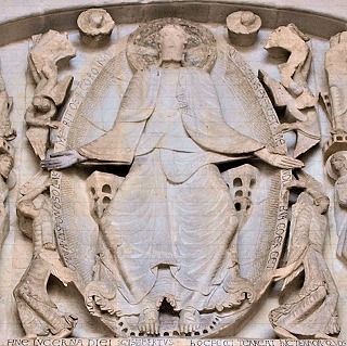 | Du 12e siècle, le tympan est attribué à Gislebertus, sculpteur qui a travaillé en Bourgogne, et on retrouve l'inscription latine "GISLEBERTUS HOC FECIT" (Gislebert a fait cela) sous les pieds du Christ. Ce serait la signature du sculpteur, ce qui était très rare au Moyen Age. | |||