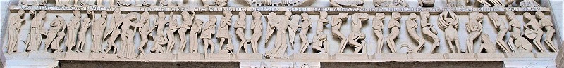 | タンパン下の2つの石で構成されたリンテルは、死者の復活を表現しています。中央で剣を携えた大天使ミカエルが、長方形の墓から出てきた選ばれた者と地獄に落とされた者とを分けています。蘇った人の振分けは、復活したすぐ後、審判を受ける前に行われます。 | ||