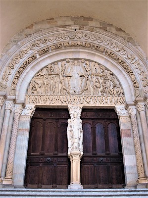 Christ en majesté 「栄光のキリスト」が「最後の審判」のシーンの中央にあります。 キリストは腕を大きく広げ、4人の天使に支えられたマンドルラの中で玉座についています。その頭は1766年の漆喰を塗る間に破壊されましたが、1948年に元に戻されました。 マンドルラにはラテン語の記述が幾つかあります。 上にある2つのディスク型のものは、太陽と月を表します。 この彫刻士の特徴は、立体感、縦に長く伸びた人物の表現にあり、とても個性的なスタイルです。 |