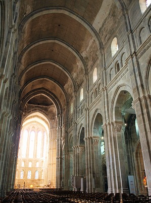 | ゴシックの外観とは対照的に、大聖堂の内部は12世紀後半に遡るロマネスク・スタイルを呈しています。 現存するクリュニー系教会堂の中で、オータンの大聖堂の身廊が最も広い造りです。 身廊は7ベイからなり、両脇に側廊があります。身廊は尖頭型ヴォールトで覆われ、横断アーチは十字型のピラーについている溝彫りされたピラスターに繋がっています。 元来天井は木造でした。13世紀、木造天井は尖頭型のヴォールトに替わり、新しい身廊の石造ヴォールトを支えるために、フライング・バットレスが設置されました。 溝彫りされたピラスターは身廊にあるピラーの各面にあり、これは例外的です。 Contrairement à l'extérieur gothique, l'intérieur de la cathédrale présente le pur style roman du deuxième quart du 12e siècle. La nef, composé de sept travées flanquées de bas-côtés, est la plus grande nef clunisienne encore existante. Elle est voûtée en berceau brisé sur doubleaux à double rouleau qui reposent sur les pilastres cannelés aux piliers cruciformes. A l'origine, elle était couverte en charpente. Au 13 e siècle, la voûte en berceau brisé a remplacé le plafond en bois, et les arcs-boutants ont été mis en place pour soutenir la nouvelle voûte. Les pilastre cannelés apparaissent sur chaque côté des piliers de la nef, ce qui est exceptionnel. |