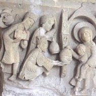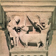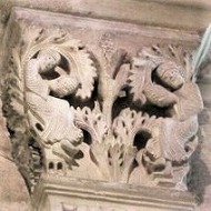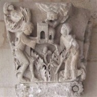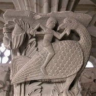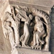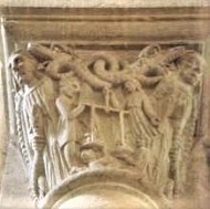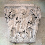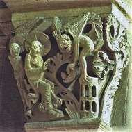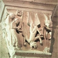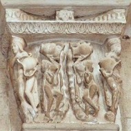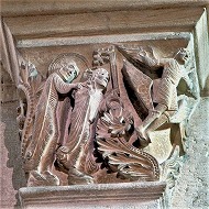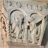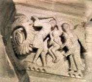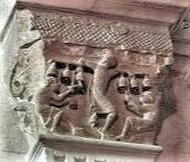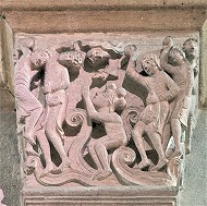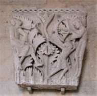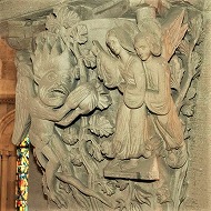 | オータンの大聖堂はロマネスクの素晴らしい柱頭彫刻で有名で、全部で約100もの柱頭があります。これらは1130年から1135年に、殆どがナルテックス入り口の彫刻を手掛けたジスルベルトゥス、又は彼のアトリエにより制作されました。僅か2つの柱頭彫刻のみ、ムティエ・サン・ジャンの職人によるものとされます。 アプスの連続アーチにある柱頭が、大聖堂の中で最も古いようです。23の柱頭が19世紀にチャプター・ハウスに移され、コピーと置換えられました。ヴェズレーのサント・マリー・マドレーヌ大聖堂、ソーリューのサン・タンドッシュ大聖堂、クリュニーのサン・ピエール・エ・サン・ポール修道院教会、ボーヌのノートル・ダム大聖堂等に、同じテーマの柱頭彫刻が見られます。 これら柱頭は高い位置にあり、教会堂内部は薄暗がりであるため、なかなか目でとらえることは難しいです。 |