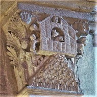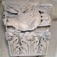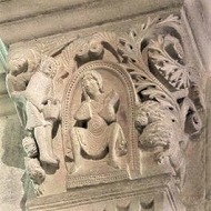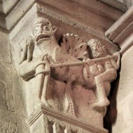 | 柱頭のテーマは左から、イエス・キリストの神殿奉献、エウスタキウスの伝説、ヒエロニムスとライオンを表現しています。 コーベルには、ロバに乗ったバラムがあらわされています。フードを被ったバラムは、修道士のようです。 Les chapiteaux sont consacrés, de gauche, à la Présentation de Jésus au Temple, à la légende de saint Eustache, et à saint Jérome et le lion. Le corbeau représente Balaam sur son anesse à droite. Balaam avec capuchon ressemble à un moine. ピラスターの上のコーベルは、19世紀に制作されたコピーです。オリジナルはチャプター・ハウスで展示されています。 Les corbeaux sont des copiés du 19e siècle. Les originaux se trouvent dans la salle capitulaire. |