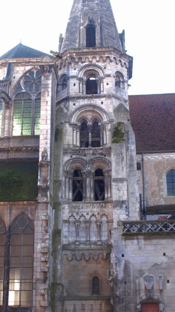 | Clocher roman 12世紀に建設された4層からなるロマネスクの鐘楼は、高さ39メートルに達します。この鐘楼は、近隣のサン・ジェルマン修道院の鐘楼やラ・シャリテのノートル・ダム小修道院教会の鐘楼からインスパイアされています。 1層目には、連続アーチの形をしたコルニッシュの上に、柱頭彫刻がある彫刻装飾が施された小円柱からのぼる五葉形の連続アーチが見られます。 2層目には柱頭彫刻がある小円柱に囲まれた、半円型の対になった開口部が設けられていて、そのアーキヴォールトにはパール状装飾が施されています。 3層目の柱頭彫刻がある小円柱に囲まれた2つ一組の開口部は、尖頭型になっていて、鋸歯の装飾がある半円型のアーキヴォールトに囲まれています。 最上層は八角形プランになっていて、連続アーチの形をしたコルニッシュの下に、小さな開口部と大きな開口部が交互に設けられています。大きな開口部は柱頭彫刻がある小円柱で装飾され、パール状装飾が彫刻されたアーキヴォールトに囲まれています。 鐘楼上部を飾る尖塔は15世紀に造られました。複数の開口部が設けられています。 |